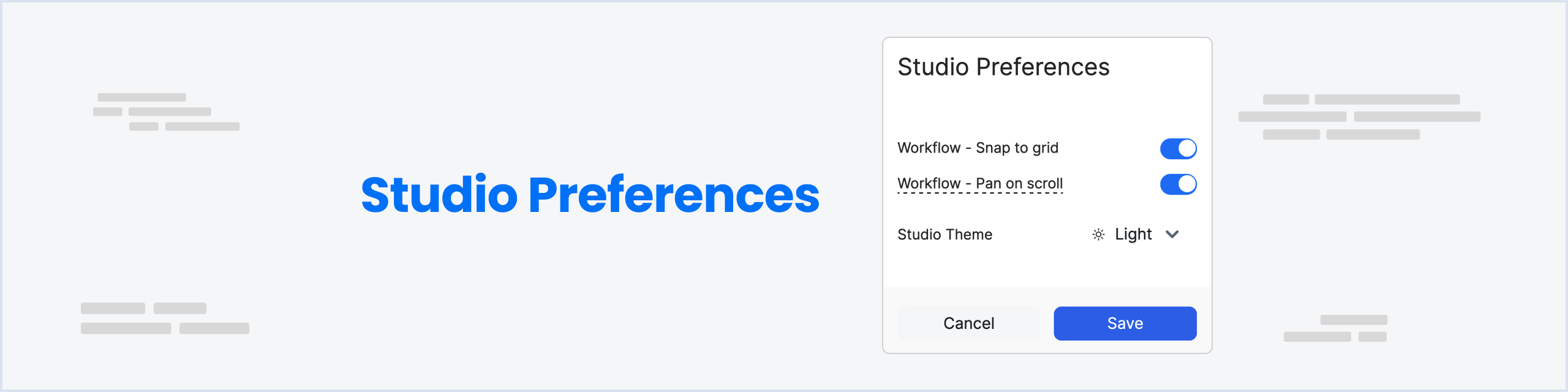 When the Snap to Grid feature is turned off, the Workflow editor allows for more free-form movement of nodes and connections. Nodes and connections can be dragged and placed anywhere on the canvas, without being automatically aligned to the grid. This can be useful for creating more complex and visually dynamic Workflows that don’t conform to a strict grid layout.Studio Theme